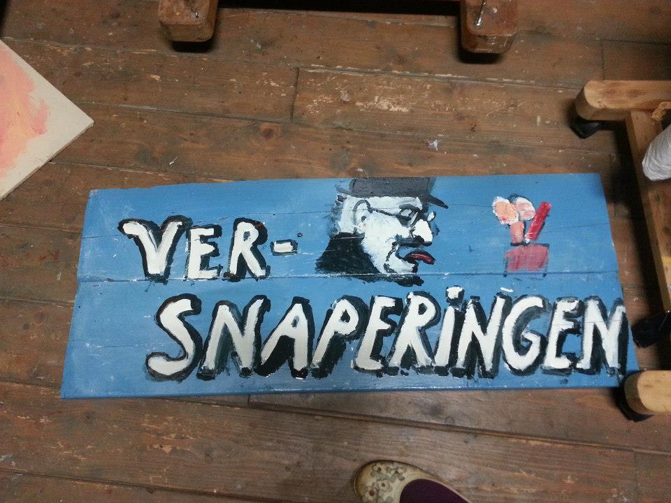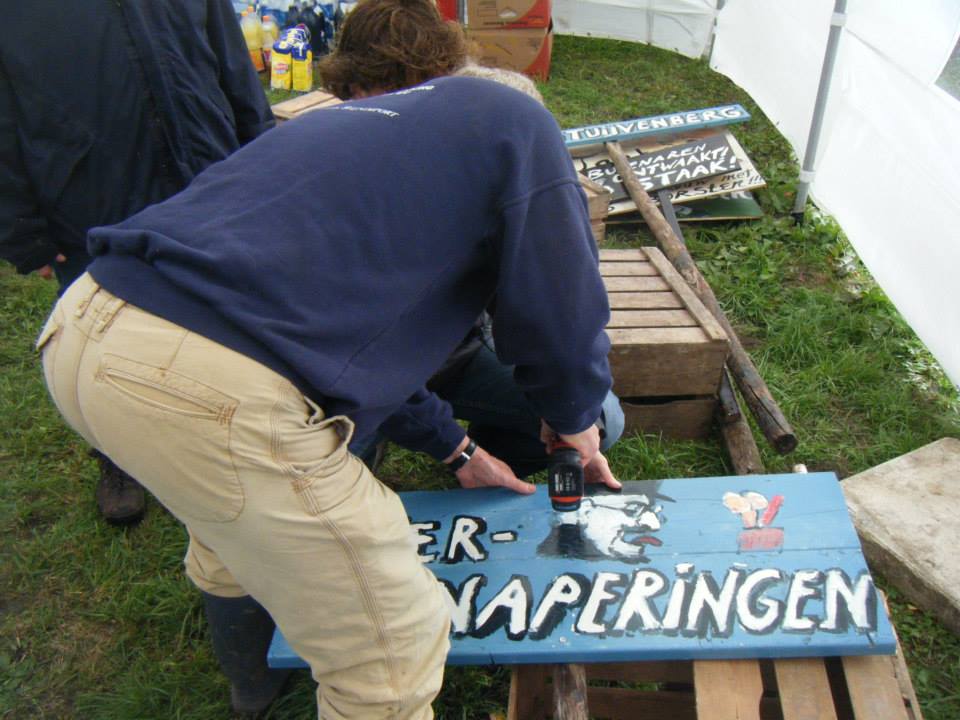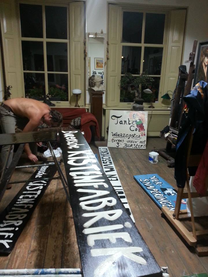 Kunstenaar Misha Blom van Kunsthof de Heuf maakt de borden voor de theatervoorstelling ‘1906- kroniek van grote en kleine mensen aan de korne’. Productie van BurenToenTheater